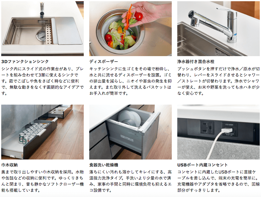 - キッチン:アイランドキッチン+ディスポーザー付き:アイランドキッチンで家族の会話も回りやすく、ディスポーザーが「生ごみを瞬時に処理」してくれるので、キッチンの清潔さも高まります。